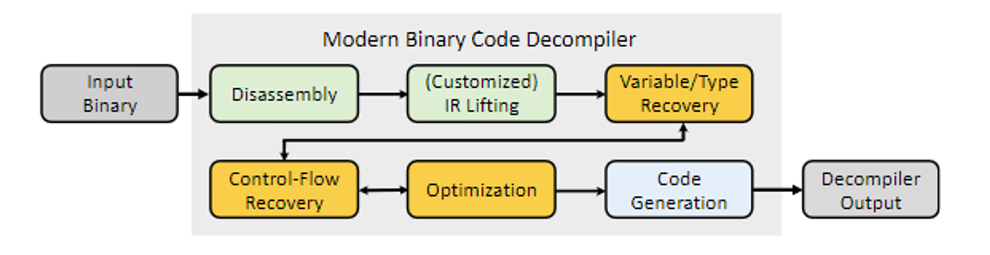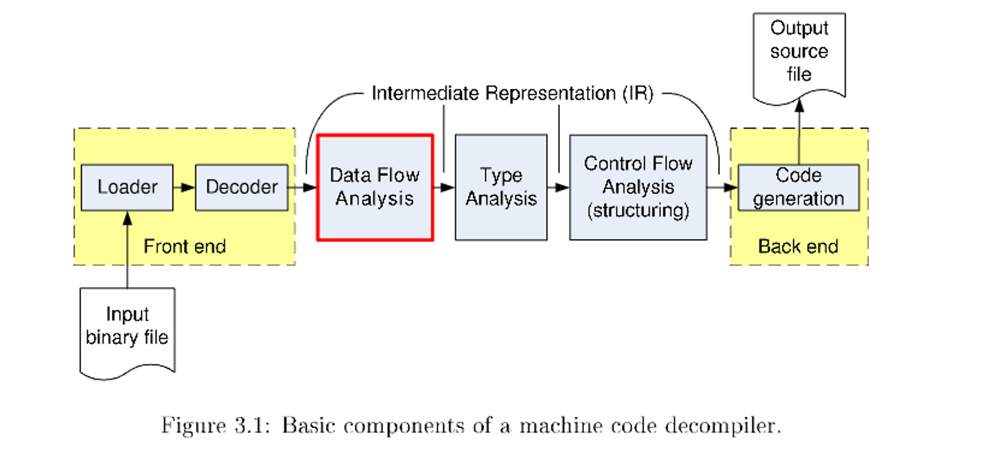 但是相比与编译器他的结构是反过来的，即，反编译器的前端处理的是二进制与机器码，后端目标是生成人类可读甚至直接可编译的源代码。