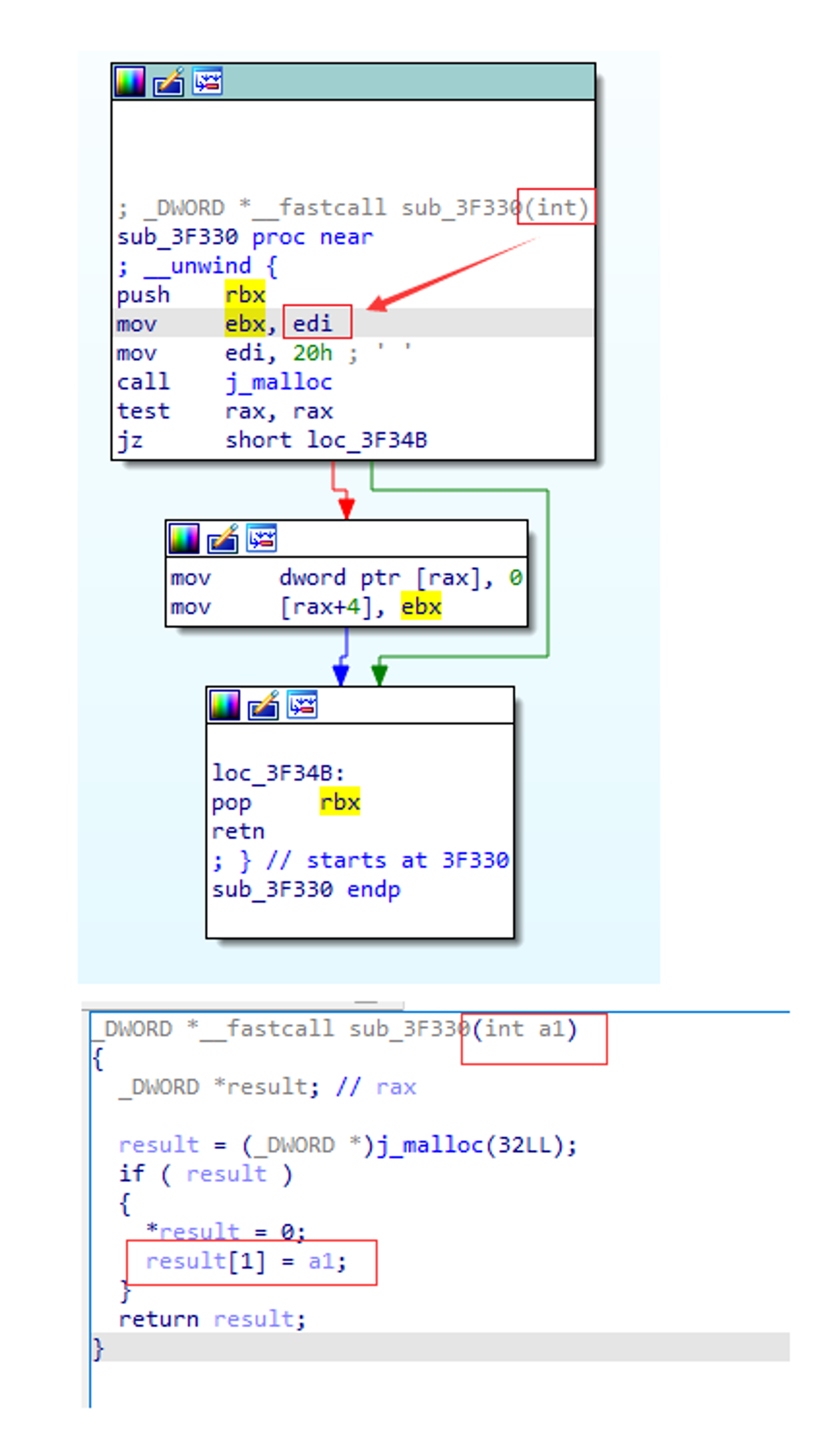 看下面这个图，mov ebx, edi; 以及 mov \[rax+4], ebx 这两条指令，通过复制传播，可以推断出函数的入参RDI放入了\[rax+4]中。