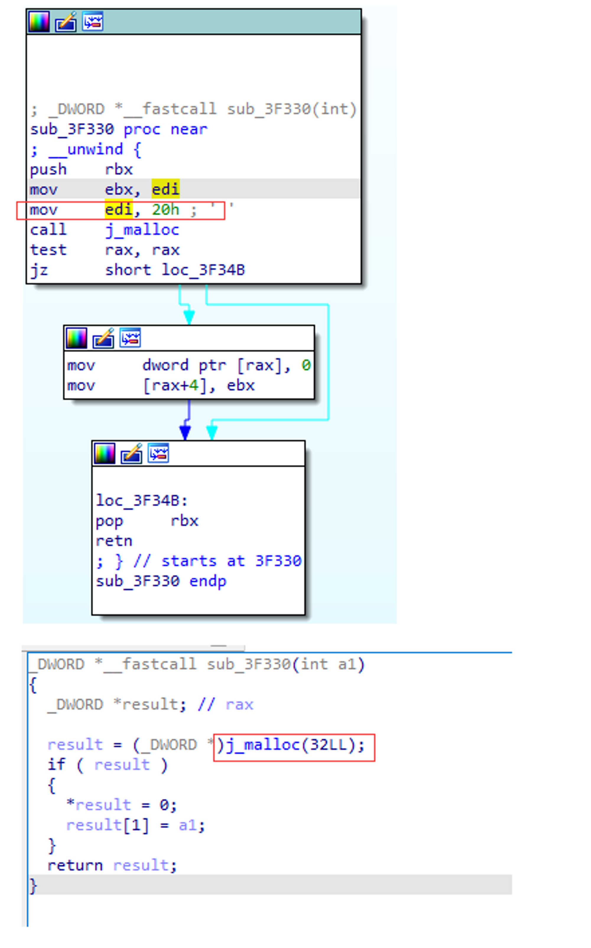 同理，还是同样的图，在malloc调用的时候，由于调用约定的要求，第一个参数通过RDI寄存器传入。通过常量传播技术，可以知道EDI=0x20，因此在最终的F5代码生成时，就能清楚的知道malloc的参数为常量0x20。